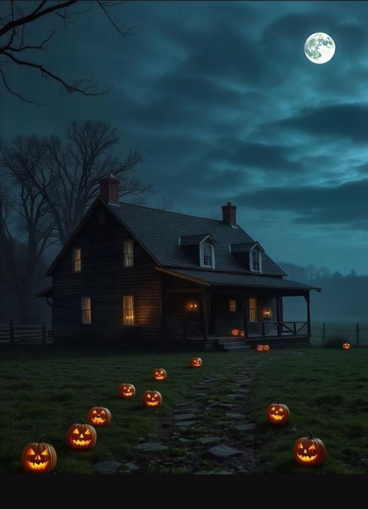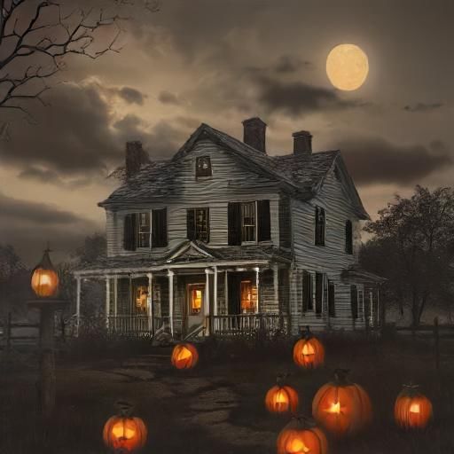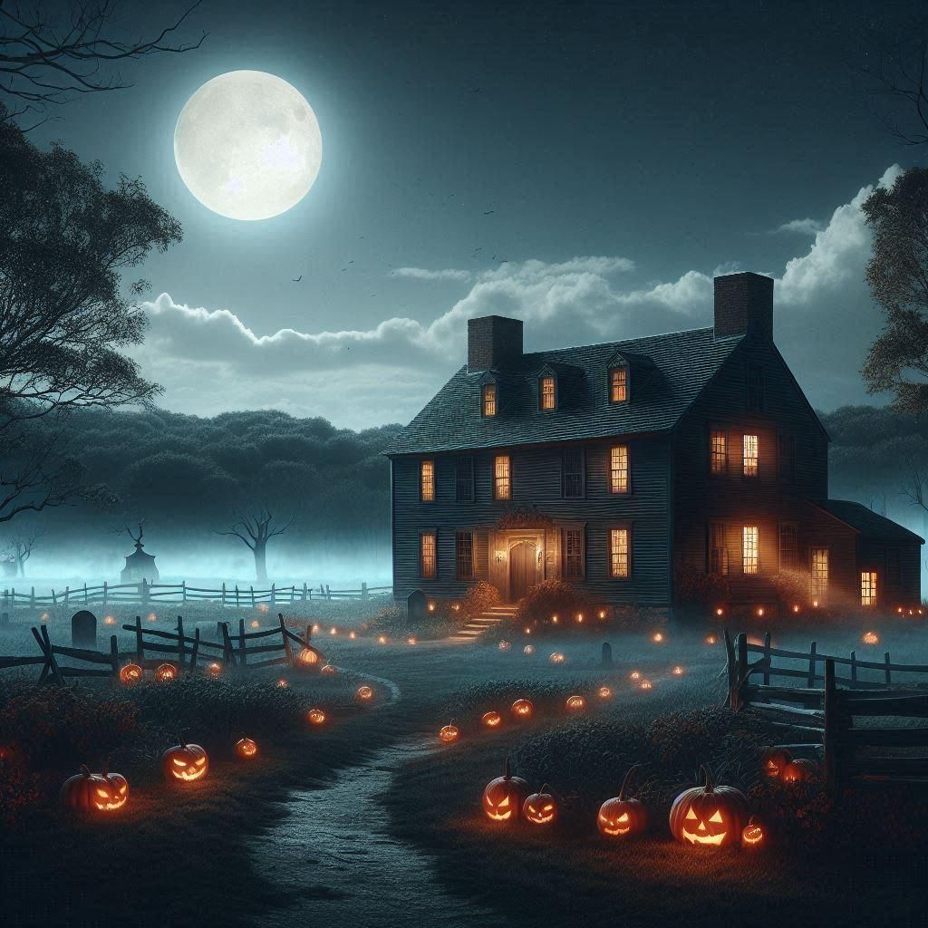 Please make me a picture of a spooky revolutionary era farmhouse at night. The moon is visible in a lightly clouded sky. There are creepy woods in the background and mist rolling across the fields. The house is lit with candles, and the path to the house is lined with jack-o-lanterns.