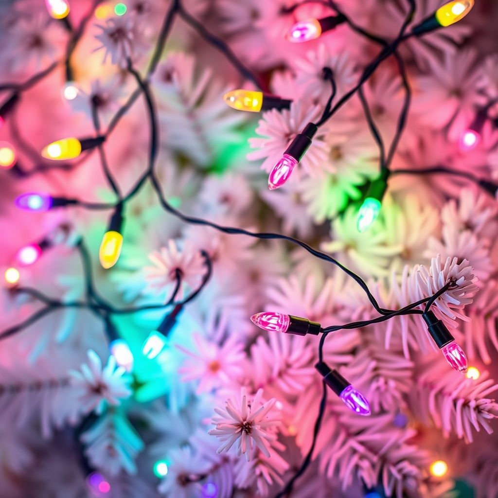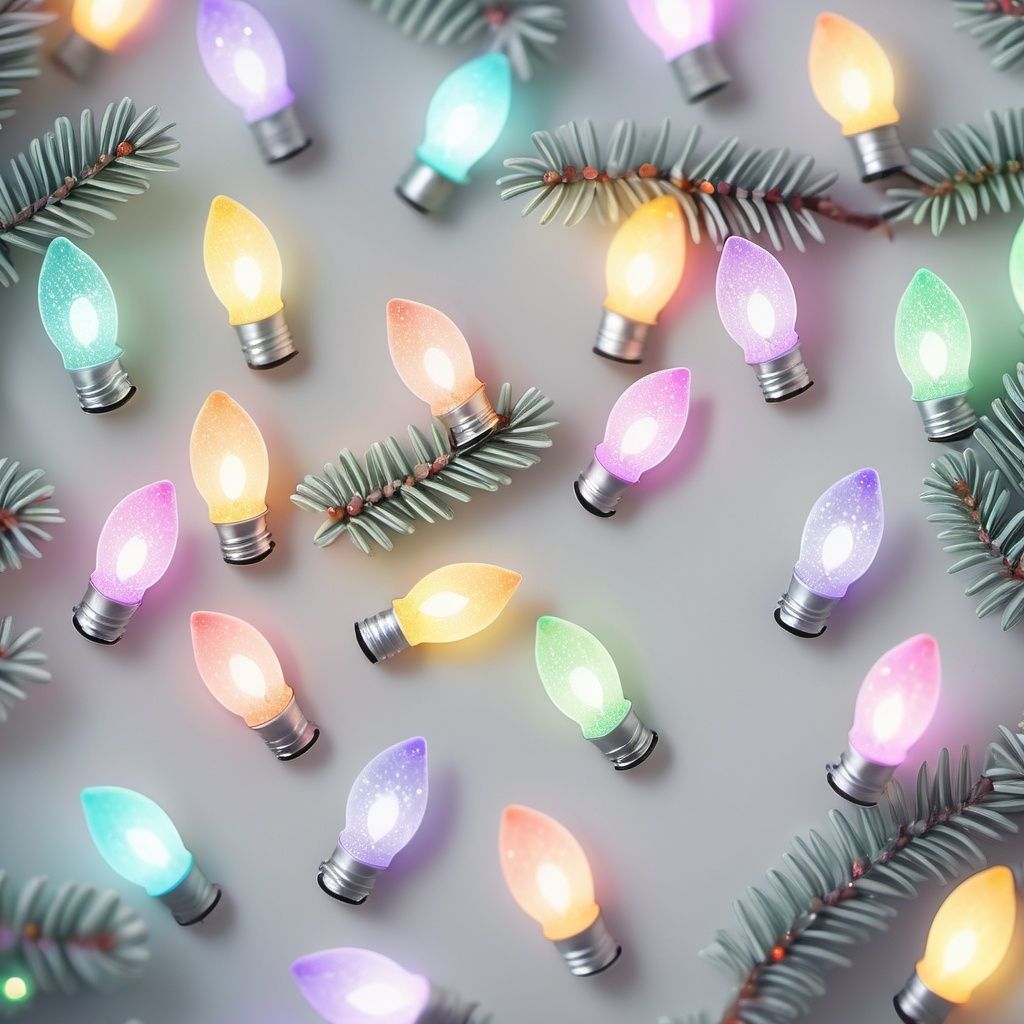 A tileable pattern of pastel rainbow mini Christmas lights over a background of white spruce branches with lots of glitter and a gentle bokeh effect.